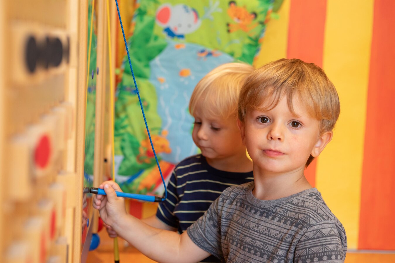 Im Spiel- und Spaßraum finden die kleinen Zwerge ein Kinderparadies vor: mit Bällebecken, Rutsche, Kletterwand, Hängematte, Geschicklichkeits- & Lernspielen, Lego, Holzbausteinen und vieles mehr.
