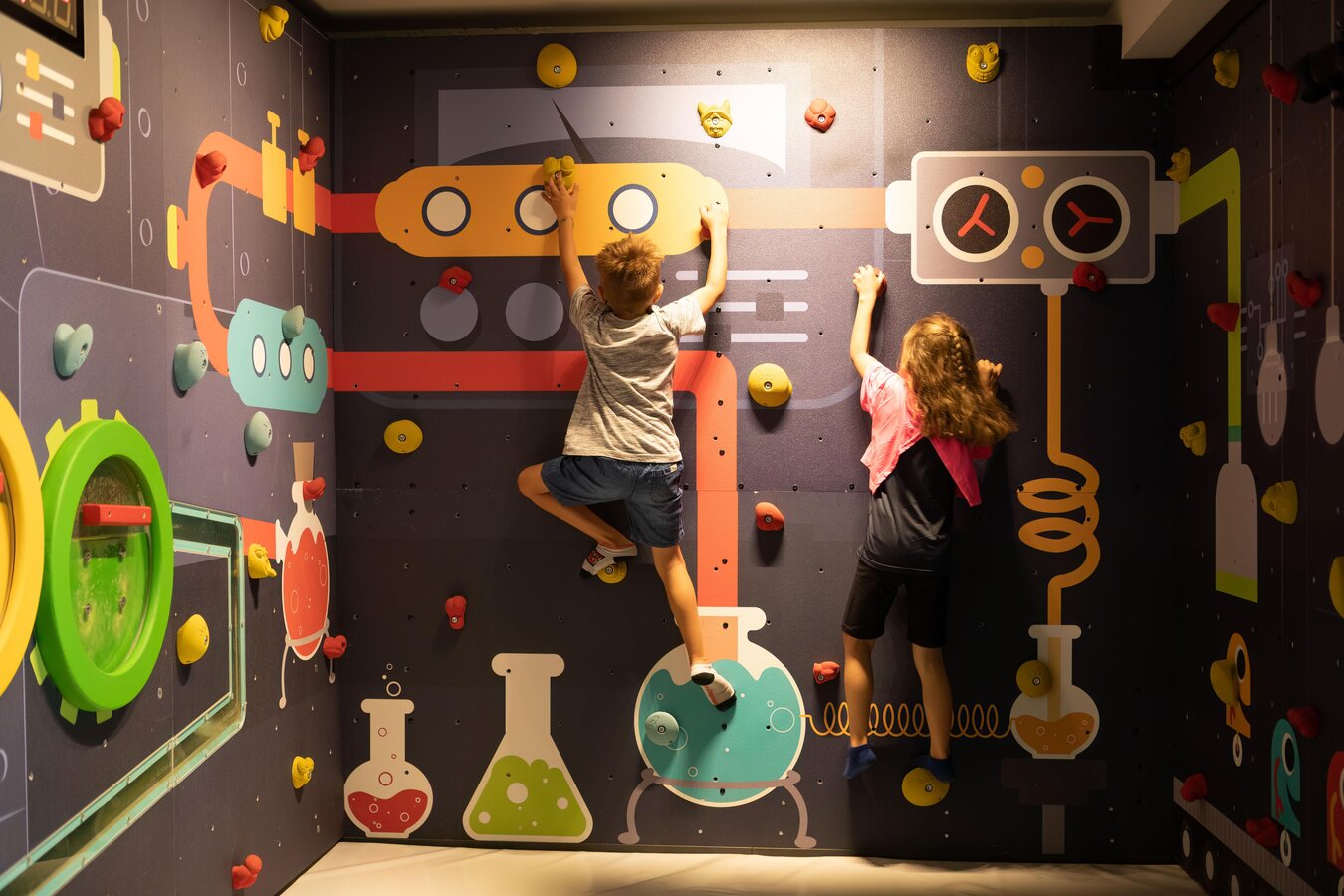 The colorful bouldering area with soft mats is perfect for younger children who want to discover their climbing skills in a playful way.