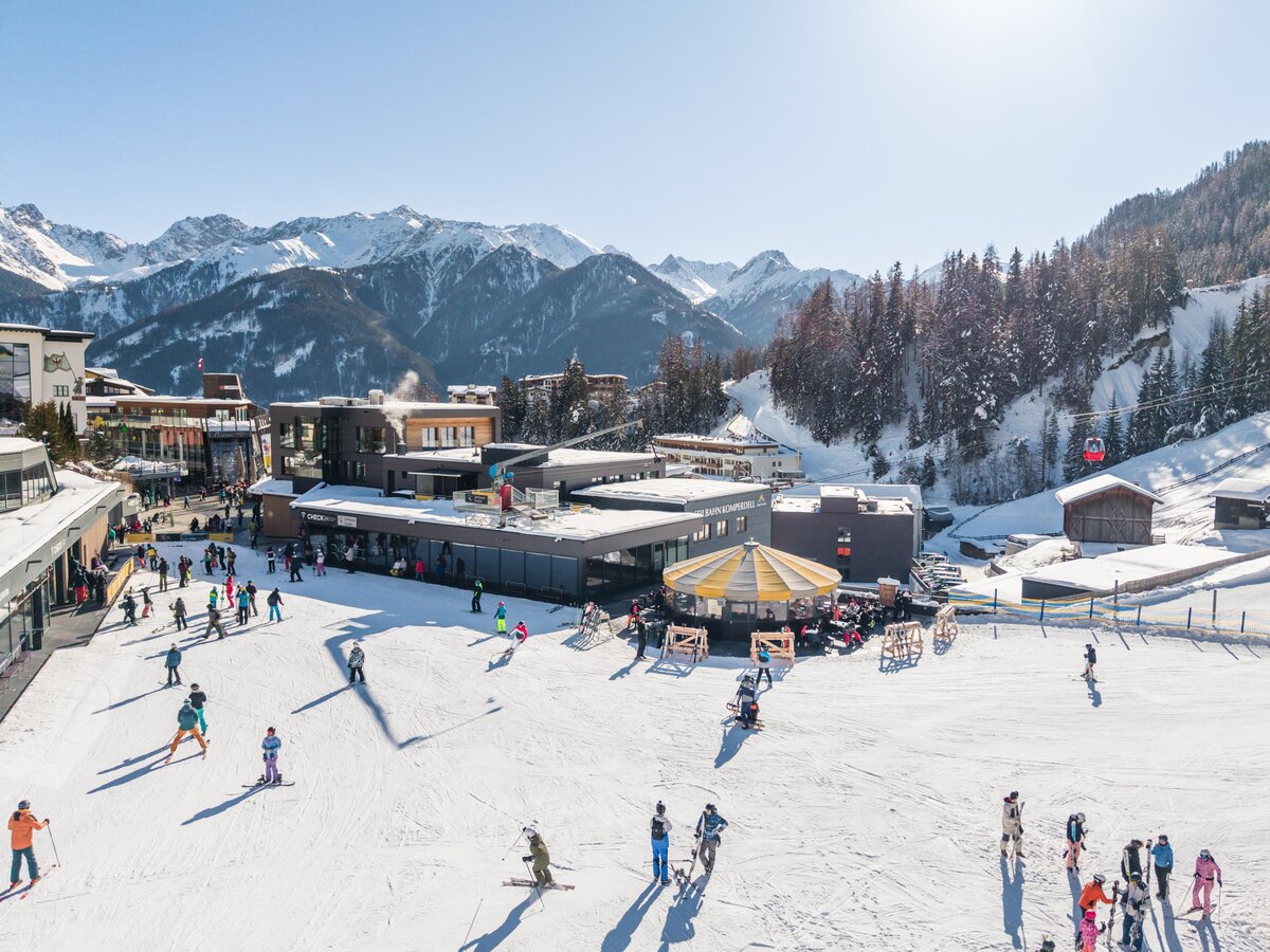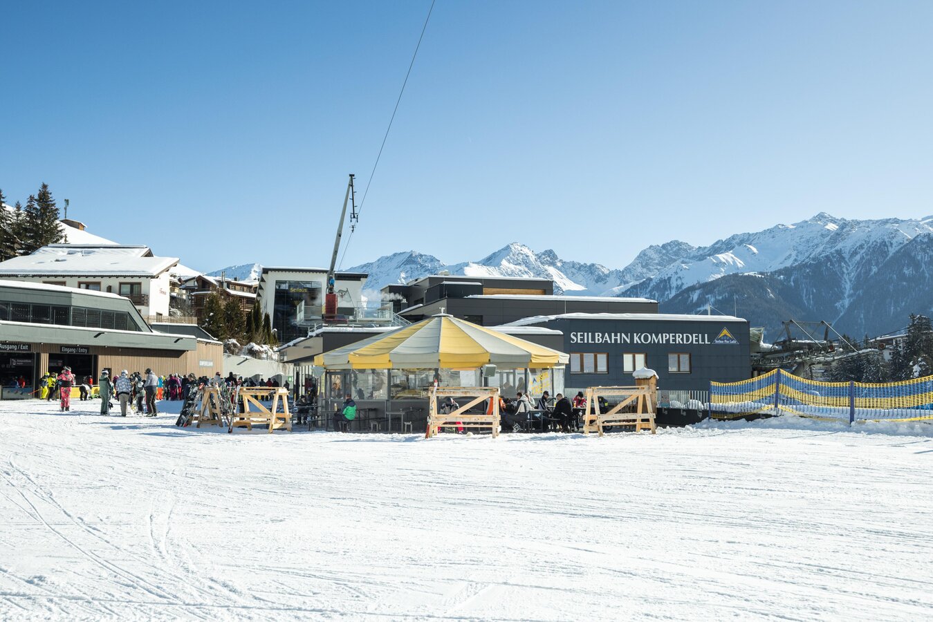 Stop by for a drink during the day or pop in after your hike in the afternoon. The umbrella bar is located directly at the Komperdellbahn cable car bottom station and Sunliner cable car bottom station. Interactive water games and a large sand play area await you and your children on the newly designed forecourt between the Komperdellbahn cable car bottom station and the Sunliner cable car bottom station. Around the new water and sand play area, cosy seating invites you to end the day with a refreshing drink.
