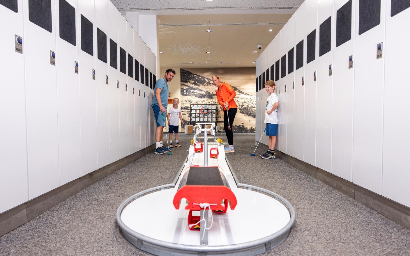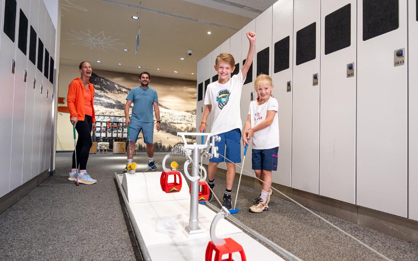 In summer, the comfortable ski depot at the Schönjochbahn valley station transforms into an exciting indoor play paradise. The highlight is the diverse mini-golf course, where visitors of all ages can perfect their swing and put their skills to the test across 18 unique holes.